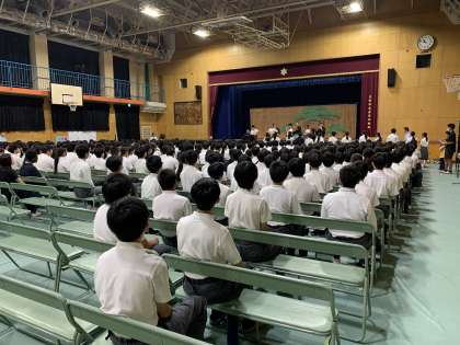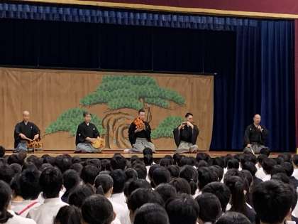 京都能楽囃子方同明会の方に来校いただき、日本の伝統芸能である能の音楽について教えていただきました。ひな祭りでお馴染みの5人囃子で、向かて右側から謡→笛→小鼓→大鼓→太鼓の順に並ばれて、掛け声や間合いを取って心地良いリズムを刻んでいただきました。生徒もその掛け声に興味を抱いたのか、休み時間に「イヤー」「ヨーイ」等と声を出して楽しんでいました。