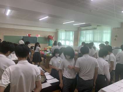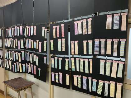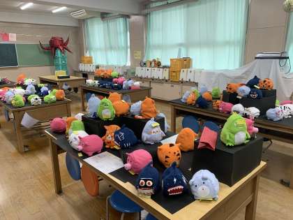 1年生は『平織の紙しおり』、2年生は『切る』をテーマに調べ学習を行いレポート、3年生は基礎学習を活かした立体作品『幼児の喜ぶぬいぐるみ』を作りました。どの作品もモノづくりを楽しみながら集中して、丁寧に仕上げてきた力作です。