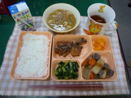 【本日のメニュー】鯖の竜田揚げ、ちくわとこんにゃくの煮もの、小松菜のおひたし、みかん缶詰、豚汁でした。