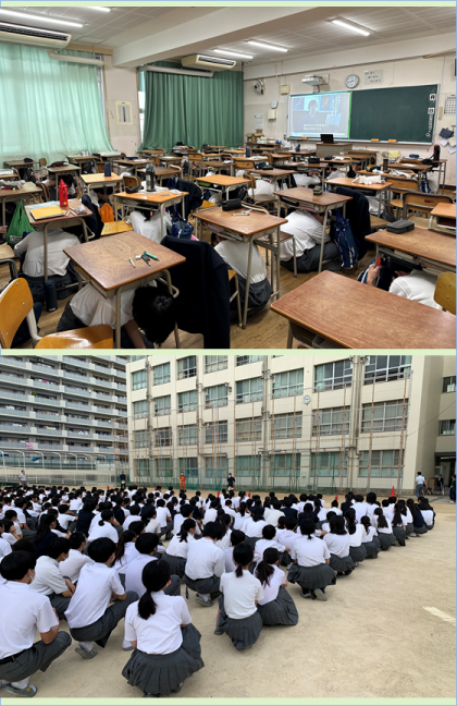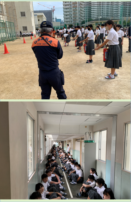 地震が起こった時を想定して、机の下に身を隠しました。そして、理科室からの出火があったという想定で、運動場に避難し人員点呼をしました。ここでは淀川消防署の方から話を聞いたのち、水消火器訓練を行いました。最後に、津波が来ることを想定して、4階へ避難しました。