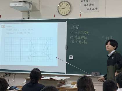 直線や角、円などに関する平面図形の基本的な性質を学びました。対称移動について学習し、垂直二等分線と中点について学び、角の二等分線を書く練習をしました。主体的に作図に取り組んでいました、