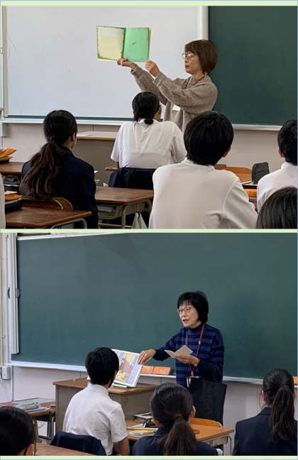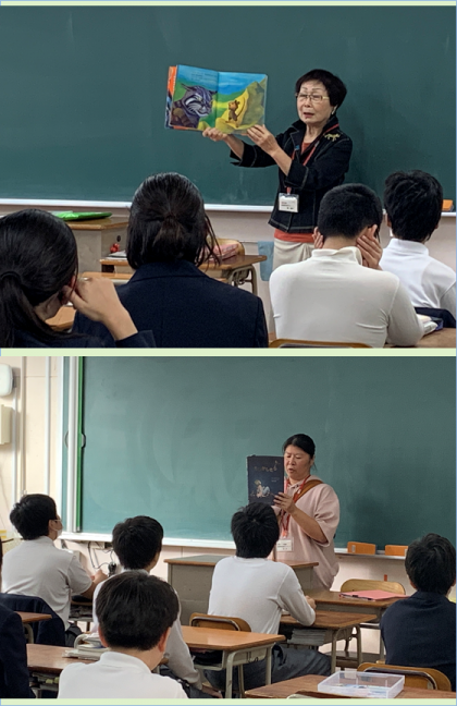 地域にお住いの元気アップボランティアの方に来ていただき、1年生対象に各クラスごとで絵本の読み聞かせをしていただきました。生徒は静かにしっかり耳を傾けて、本の世界に入り込んでいました。