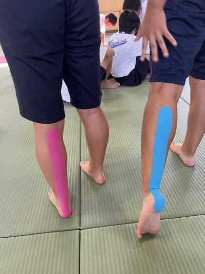 身体の仕組みを知り、テーピングの効果と巻き方を学びました。