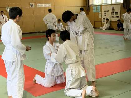 ひざ立ちの姿勢から、互いに襟を持ち合い、寝技で1本まで持ち込む試合をしました。総合順位に基づいて力の拮抗している者同士で対戦し、二人の審判がつく中、迫力ある取り組みで真剣勝負が行われました。生徒は楽しみながら柔道の技術が向上しています。