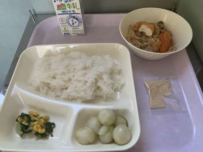 今日のメニューは、中央区開閉小学校の給食委員会が考えた作品で、「ジャージャンどうふ」「チンゲン菜のオイスターソースあえ」「まっ茶白玉のきな粉がけ」「ごはん・牛乳」でした。