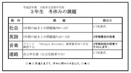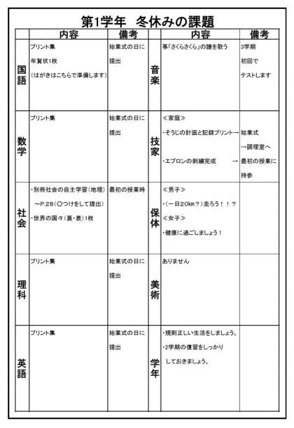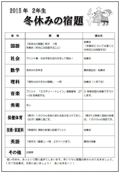 さて、冬休みの課題は着々とすすんでいるでしょうか。各学年の課題一覧を掲載しますので、計画的に取り組み、新学期をむかえる準備をしましょう。