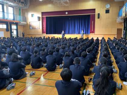 校長先生からは、世相を反映する漢字についての話がありました。熊野本宮大社では、新年への希望を込めた漢字を書く「一文字揮毫(きごう)」が行われ、宮司さんが「思」の文字を大書した話がありました。「日本原水爆被害者団体協議会」のノーベル平和賞授賞式を受け、家族や友人など大切な方々への思いとか、人が人を思う優しさが平和につながるという話でした。「思いやり」の気持ちを持って学校生活を送ってください。