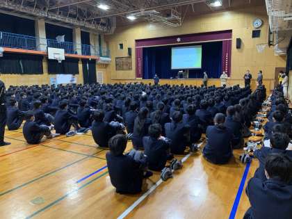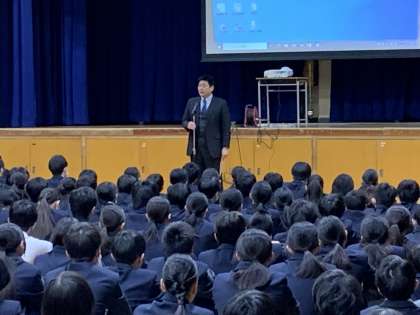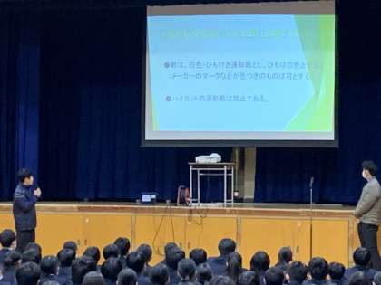 生活指導部長の先生から、靴のルール見直しについての話がありました。来年度の4月から現在のルールが緩和されて、白地にメーカーの色マークはOKとなります。これからも生徒会を通じて、生徒の皆さんが学校で過ごしやすいルール作りを行っていきます。