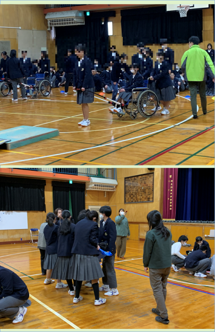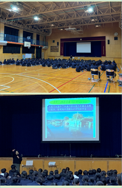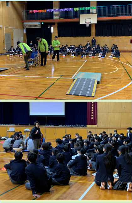 河川レンジャーアドバイザーの辻川様をはじめ、社会福祉協議会・更生保護女性会・学校元気アップの12名の方が来校され、2年生対象に「安心・安全なまちづくりをめざして」の講話と体験をしていただきました。生徒は、減災に向けて、川と寄り添う町の自然災害について考えました。その後、救出体験と車いす体験を行い、命を守る貴重な学習となりました。