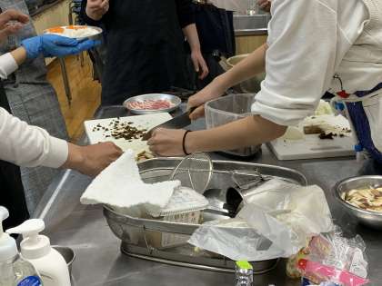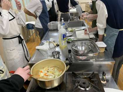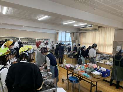 「美味しく作ることができて良かった。」「みんなで協力して効率よく作れた。」「作るのに時間がかかったが、食べるのは一瞬だった。」「家でも作ってみたい。」などの感想がありました。協力することの大切さも学ぶ楽しい授業でした。