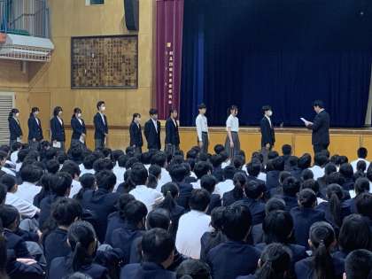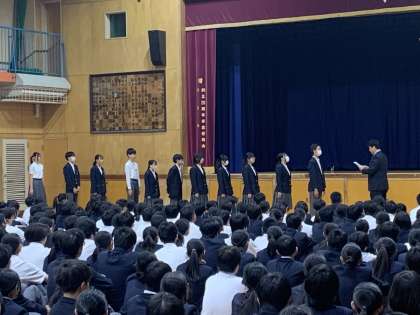 生徒会役員6人と各学年1組の学代が代表して校長先生から認証状を受け取りました。