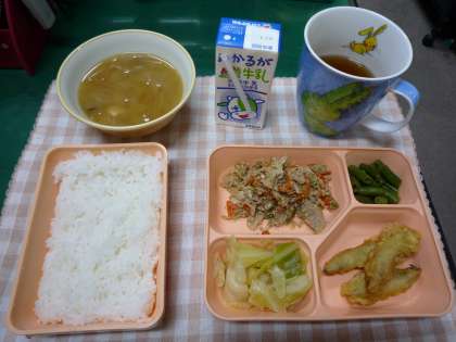 【本日のメニュー】豚肉のしょうがじょうゆ炒め、きびなごてんぷら、キャベツのおかか炒め、三度豆のおひたし、みそけんちん汁、米飯、牛乳でした。今日から2月です。けんちん汁にはゴボウ、大根、白ネギがたっぷり入って、体が温まりましたね。なお、3年生は進路懇談のため、給食はありません。