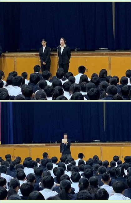 今日から3週間にわたり教育実習が始まります。2人の実習生があいさつをしました。理想の先生になれるように、生徒の皆さんも協力をよろしくお願いします。