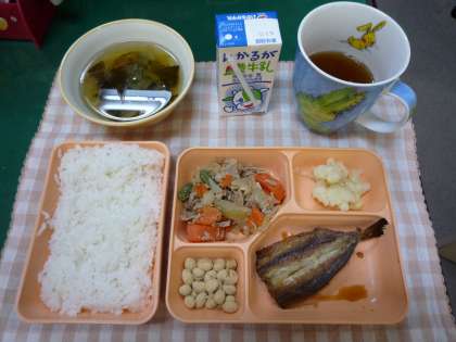 【本日のメニュー】鰯のかば焼き、豚肉と野菜の煮もの、カリフラワーの柚子の香あえ、福々豆、すまし汁、米飯、牛乳でした。