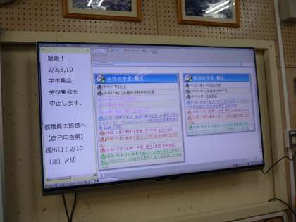 先日、職員室に設置した大型モニターで、いよいよ本日の予定=「本日の学校行事」「出張情報」「年休情報」等が表示されるようになりました。先生たちが出張申請や年休申請などを事前に入力すれば、教頭先生が毎日ホワイトボードに書かなくてもよいし、皆が情報を共有できます。