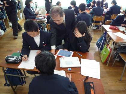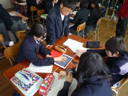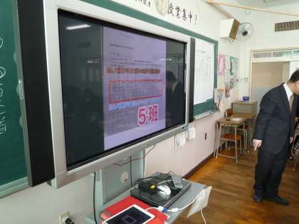 そこで、本日は本校の1年生(数学)の研究授業で、長田先生のタブレット端末を活用した協働学習が行われました。他学年の先生方も多く参観してもらいました。昨日(2月4日)には、本校にもタブレット端末40台が配置されました。今後はどの教科でもこうした協働学習が行われるよう努力していきたいと思います。