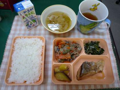 【本日のメニュー】鰤の甘辛だれかけ、筑前煮、ほうれん草ともやしのごまあえ、さつまいもの甘煮、すまし汁、米飯、牛乳でした。すまし汁の具は白菜とゆばでした。