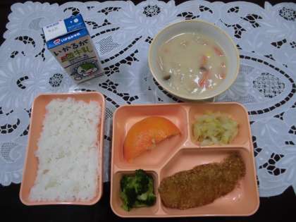 【今日の献立】クリームシチュー、ブロッコリー、サーモンフライ