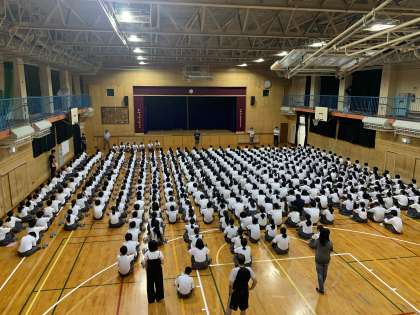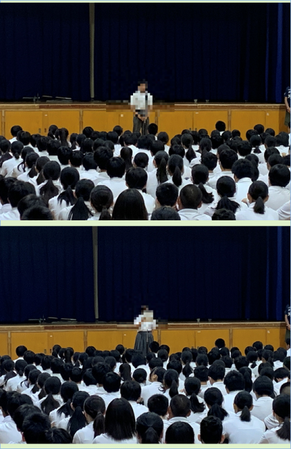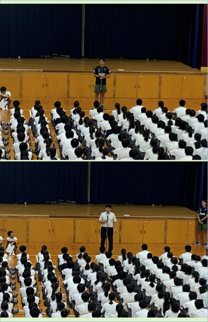 生徒指導主事の先生からは、「ちりも積もれば山となる」のことわざの意味について話がありました。薄っぺらい紙の積み上げとバレーボール部でのサーブの上達を引き合いに出し、生徒に分かりやすく説明をしました。