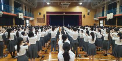 「前にならえ!」の号令に合わせて、縦の列をしっかり揃えて整列しています。