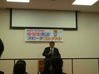 「淀川区長杯英語スピーチコンテスト」ではコンテストのルールの説明も挨拶もすべて英語で行われます。ということで、榊区長、実行委員長の名田校長先生(東三国中)、副実行委員長の恩塚校長先生(宮原中)も英語でスピーチしました。榊区長のジョークが出場者の皆さんにも理解できたでしょうか?