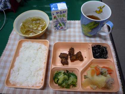 【本日のメニュー】鮪の竜田揚げ、豚肉とじゃがいもの煮もの、おおさかしろなの煮びたし、ひじきの炒め煮、すまし汁、米飯、牛乳でした。