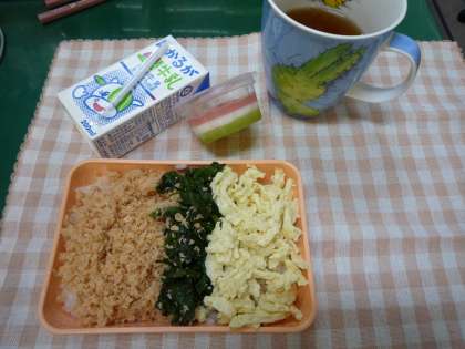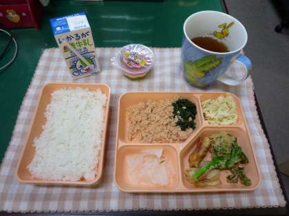 さて【本日のメニュー】三色丼(鮭そぼろ、ほうれん草、錦糸卵)、菜の花とちくわのてんぷら、だいこんの酢のもの、三色ゼリー、米飯、牛乳でした。