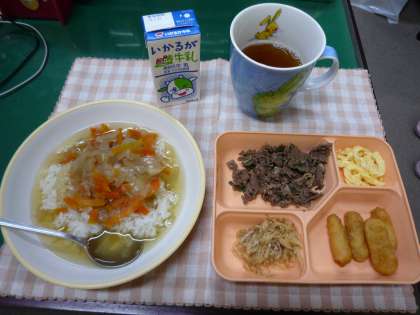 【本日のメニュー】牛肉と卵のクッパ(牛肉とニラの煮もの、錦糸卵、野菜スープ)、いかてんぷら、もやしのナムル、米飯、牛乳でした。写真のご飯に牛肉と錦糸卵を入れて食べます。