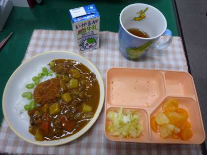 【本日のメニュー】カツカレーライス(一口カツ)・枝豆、キャベツのピクルス、フルーツミックス、米飯、牛乳でした。
