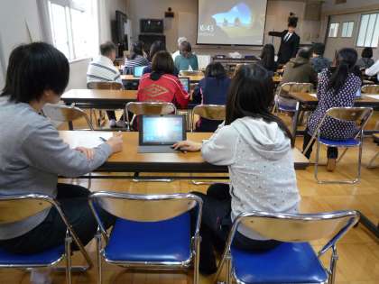 本日は他校の先生たちも参加していただき、タブレットの使い方(授業での活用方法)を研修しました。いよいよ、大阪市が推奨するICTを活用した授業を実践するため、3月に配置されたタブレットを使って、授業を行う練習です。生徒たちにもぜひ直接タブレットに触れてもらって、主体的な授業ができるようにしていきたいと思います。
