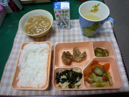 【本日のメニュー】鶏肉の竜田揚げ、いかと野菜の炒めもの、若竹煮、きゅうりの酢のもの、みそ汁(うす揚げと豆腐)、米飯、牛乳でした。 お味噌汁は具だくさんでしたね。