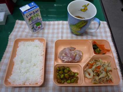 【本日のメニュー】豚肉のてり焼き、ちくわと野菜のマヨネーズ炒め、揚げ枝豆、チンゲンサイのおひたし、米飯、牛乳でした。枝豆のから揚げはしっかり味がついていました。
