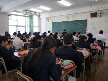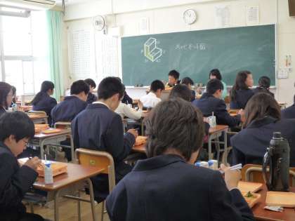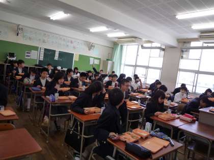 2年生、3年生は班ごとに机をくっつけて給食を食べますが、1年生はまだ、担任の先生と向き合って、おしゃべりせずに前を向いて食べる練習をしています。もう少ししたら、先輩たちのように班ごとで食べられるようになりますね。