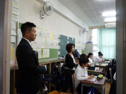 本日は、校下小学校の北中島小学校と宮原小学校から、昨年度の旧6年生担当の先生たちが、1年生の授業の様子を参観に来てくださいました。