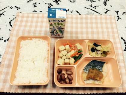 【本日のメニュー】さごしのおろしじょうゆかけ、高野どうふの煮もの、ベーコンと野菜の炒めもの、金時豆の煮もの、米飯、牛乳