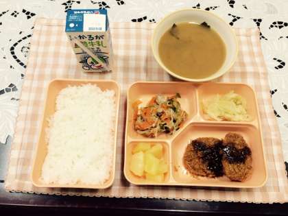 【本日のメニュー】とんかつ、鶏肉と野菜の炒めもの、キャベツの即席づけ、パインアップル缶詰、みそ汁、米飯、牛乳