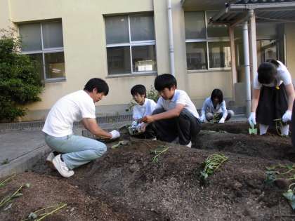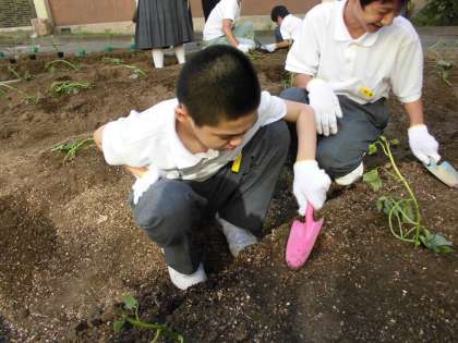 管理作業員さんにいろいろ教えてもらいながらの作業です。特別支援学級の先生方、保護者の方々も参加してくれました。