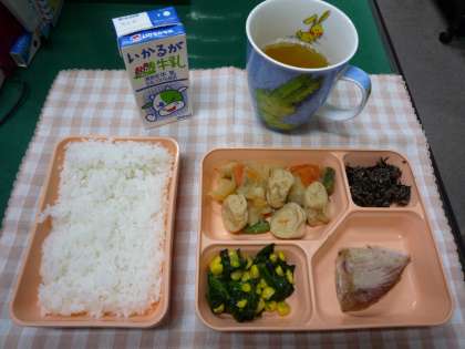 【本日のメニュー】一口がんもとじゃがいもの煮もの、鰹のしょうゆマヨネーズ焼き、ほうれん草とコーンのおひたし、牛ひじきそぼろ、米飯、牛乳でした。牛ミンチとひじきのそぼろは甘くて、ご飯のトッピングにピッタリでした。