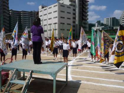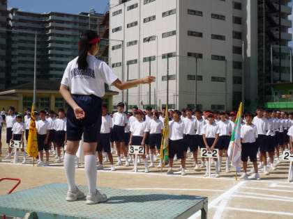 続いて、校歌斉唱、選手宣誓、プログラム1番のラジオ体操です。