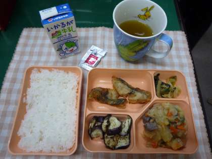 【本日のメニュー】鯵のごま揚げ、鶏肉とじゃがいもの煮もの、焼きなす、小松菜とキャベツのおひたし、米飯、牛乳でした。