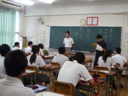 各教科では、夏休みの課題提出も一段落。今週から本格的な授業が始まっています。3年生の数学科では方程式に取組み、国語科では夏休みの間に心に残ったエピソードを1分間スピーチしています。クラスメートのスピーチを聞いて、声の大きさ、話す速度、話の内容(きちんと伝わったかどうか)を採点するために、聞く姿勢も問われます。