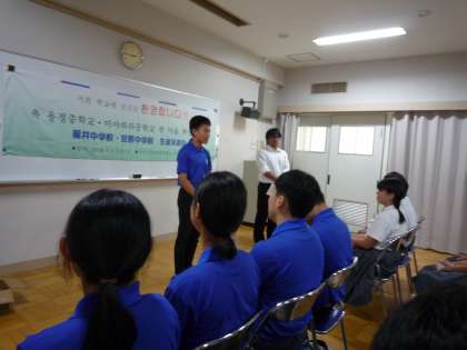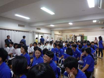 いよいよ本校生徒との対面です。まずは、両校の生徒会長の訪問・歓迎のあいさつ、続いて龍井中学校生徒からの質問に、宮原中生徒会役員が答えます。