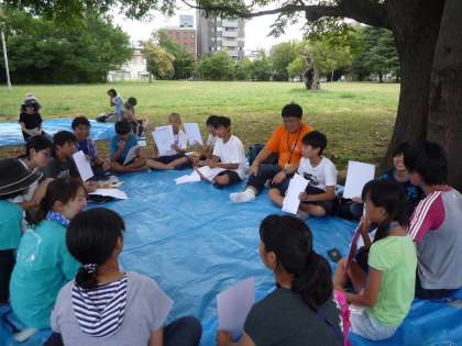 今年は、9月3日に北ブロック、城北ブロック合同の中学生モイムが行われました。いつもの通り、各チェックポイントごとに歴史クイズやパズルで得点を取っていくオリエンテーリングですが、今年は野外に出て、大阪城公園でのフィールド・ワークとなりました。また、縄跳びや鬼ごっこの運動競技の得点も加算されました。