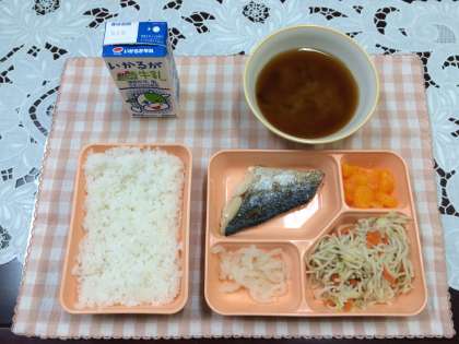 【本日のメニュー】さごしの塩焼き、塩焼きそば、だいこんの酢のもの、みかん缶詰、みそ汁、米飯、牛乳 でした。