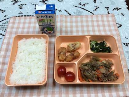 【本日のメニュー】肉じゃが、ちくわのてんぷら、小松菜とじゃこのおひたし、プチトマト、米飯、牛乳でした。