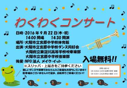 9月22日(木・祝)に宮原中学校体育館にて、NPO法人メイクイット後援の『わくわくコンサート』を開催します。