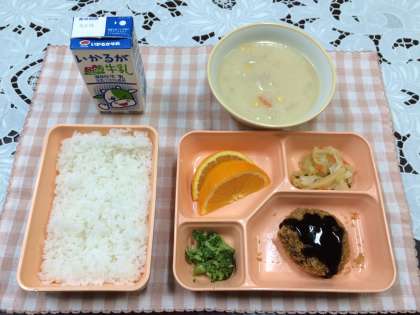 【本日のメニュー】クリームシチュー、ブロッコリー、ミンチカツ、キャベツのドレッシングあえ、オレンジ、米飯、牛乳でした。