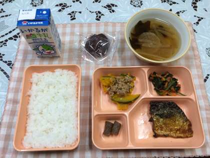 鯖のみそづけ、焼きかぼちゃのそぼろ煮、ほうれん草とにんじんのおひたし、こんにゃくの甘辛煮、すまし汁、おはぎ、米飯、牛乳でした。少し分かりにくいのですが、ビニールに入っているのがおはぎです。