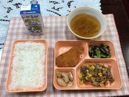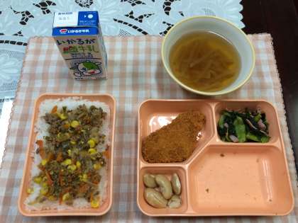 ミートピラフ、サーモンフライ、ベーコンと小松菜のソテー、白花豆のグラッセ、だいこんのスープ、米飯、牛乳でした。上の写真が配膳時の状況です。下の写真のようにミートピラフの具をのせて食べます。