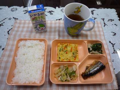 【本日のメニュー】擬製どうふ、秋刀魚のおかか煮、豚肉とキャベツの炒めもの、小松菜とだいこんの即席づけ、米飯、牛乳でした。最近は秋刀魚も高くなっているそうですね。今日の秋刀魚は、骨ごと食べられるように柔らかく煮込んでありました。